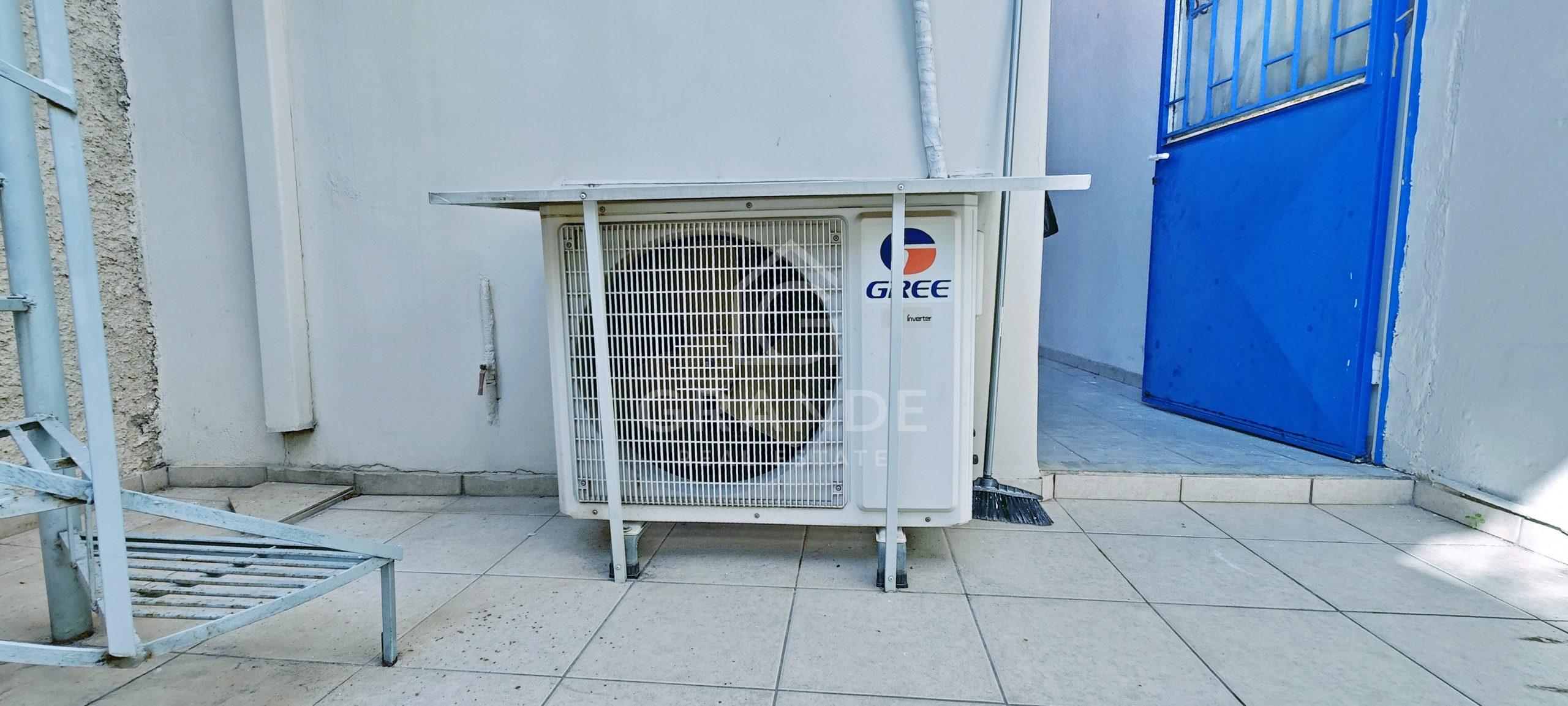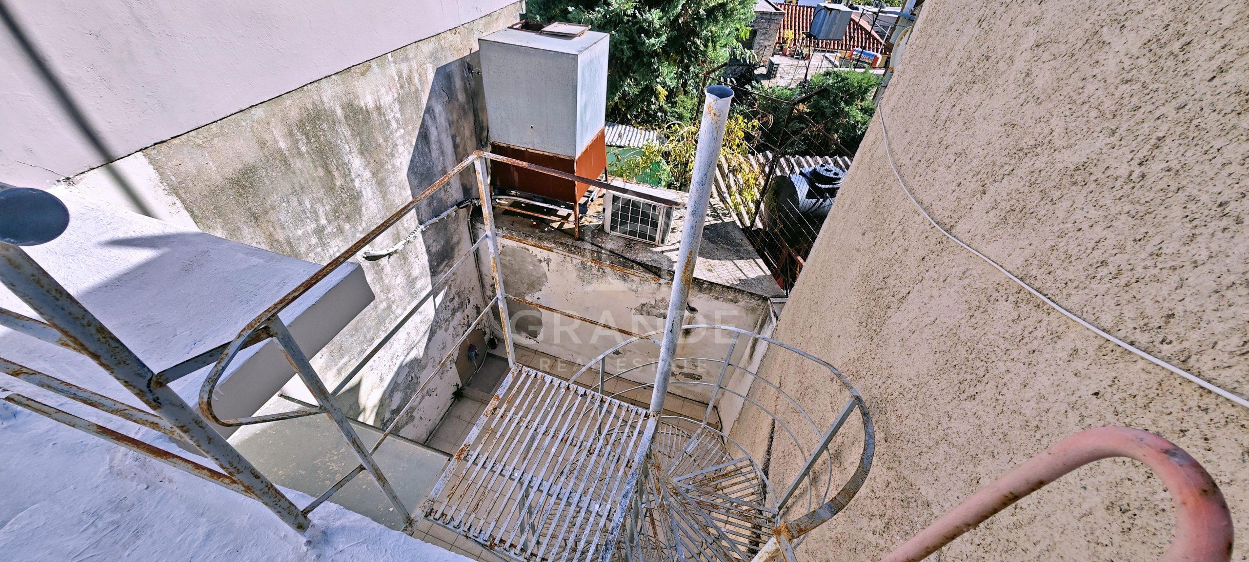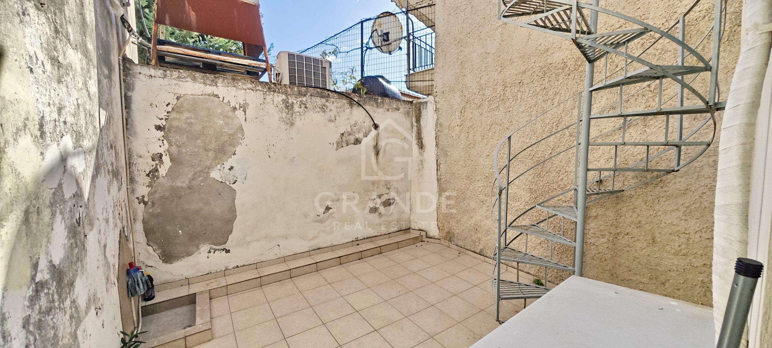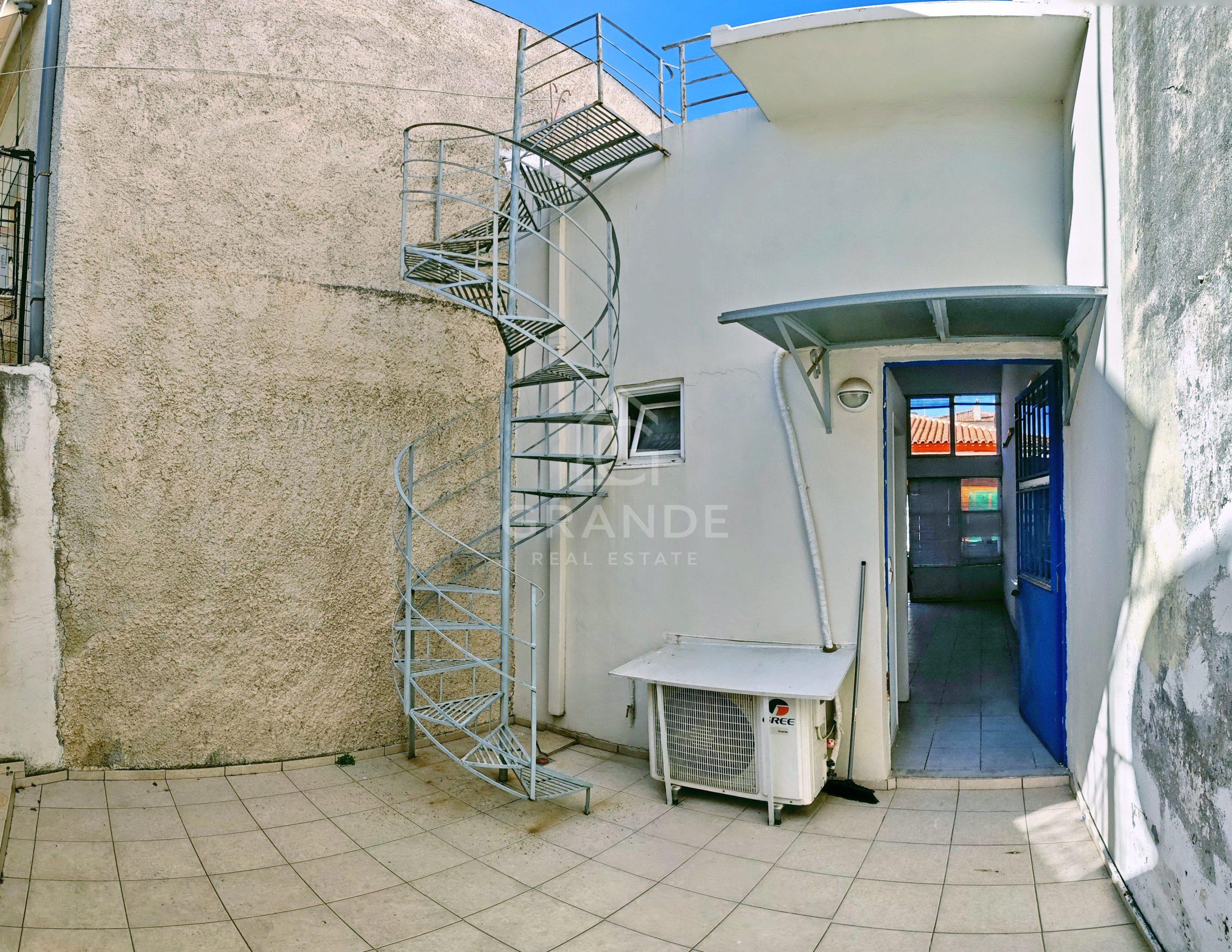 Στο πίσω μέρος υπάρχει αυλή 20 τμ καθώς και ταράτσα (προσβάσιμη με κυκλική μεταλλική σκάλα) 24τμ